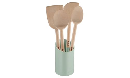 Natura K270S504 Houten accessoireset met houder - schuine spatel + grote lepel + kleine lepel + spatel + houder - lichtgroen
